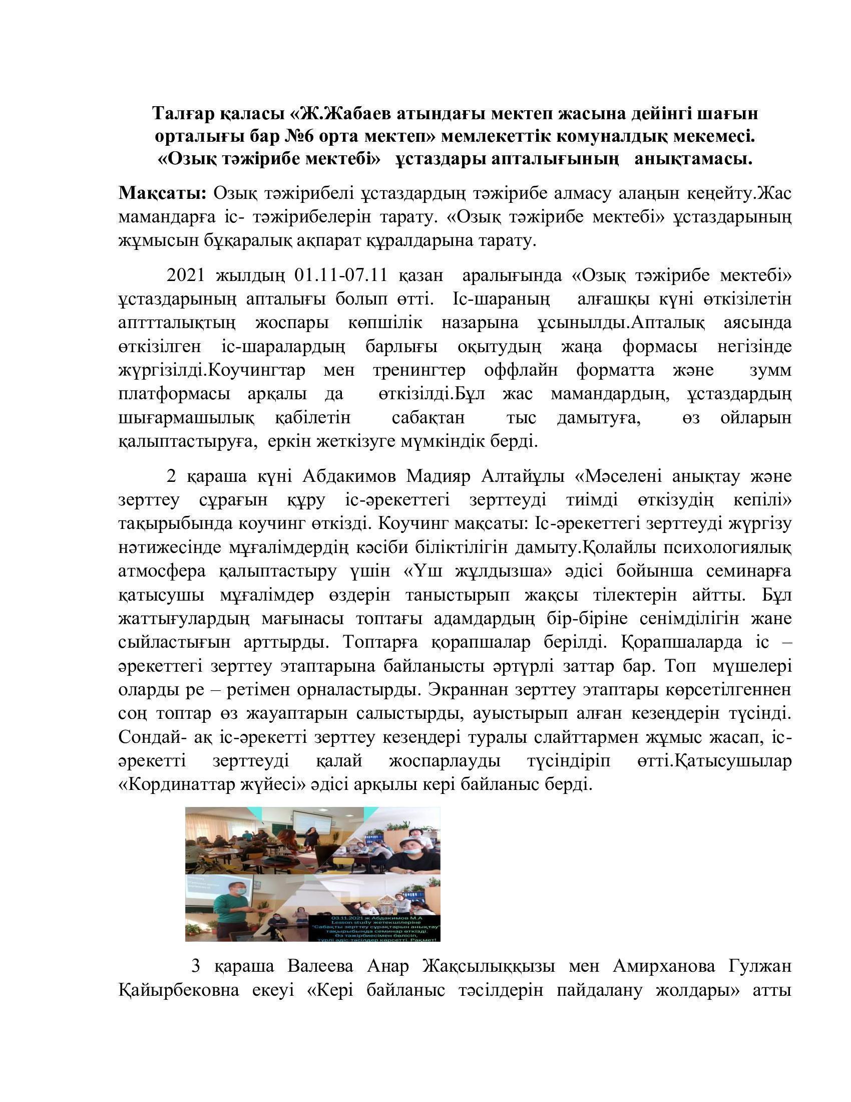 "Озық тәжірибе мектебі" ұстаздарының онкүндігі » АЛМАТЫ ОБЛЫСЫ БІЛІМ БАСҚАРМАСЫНЫҢ ТАЛҒАР АУДАНЫ БОЙЫНША БІЛІМ БӨЛІМІ МЕМЛЕКЕТТІК МЕКЕМЕСІНІҢ “ЖАМБЫЛ ЖАБАЕВ АТЫНДАҒЫ №6 ЖАЛПЫ БІЛІМ БЕРЕТІН ОРТА МЕКТЕБІ” КОММУНАЛДЫҚ МЕМЛЕКЕТТІК МЕКЕМЕСІ