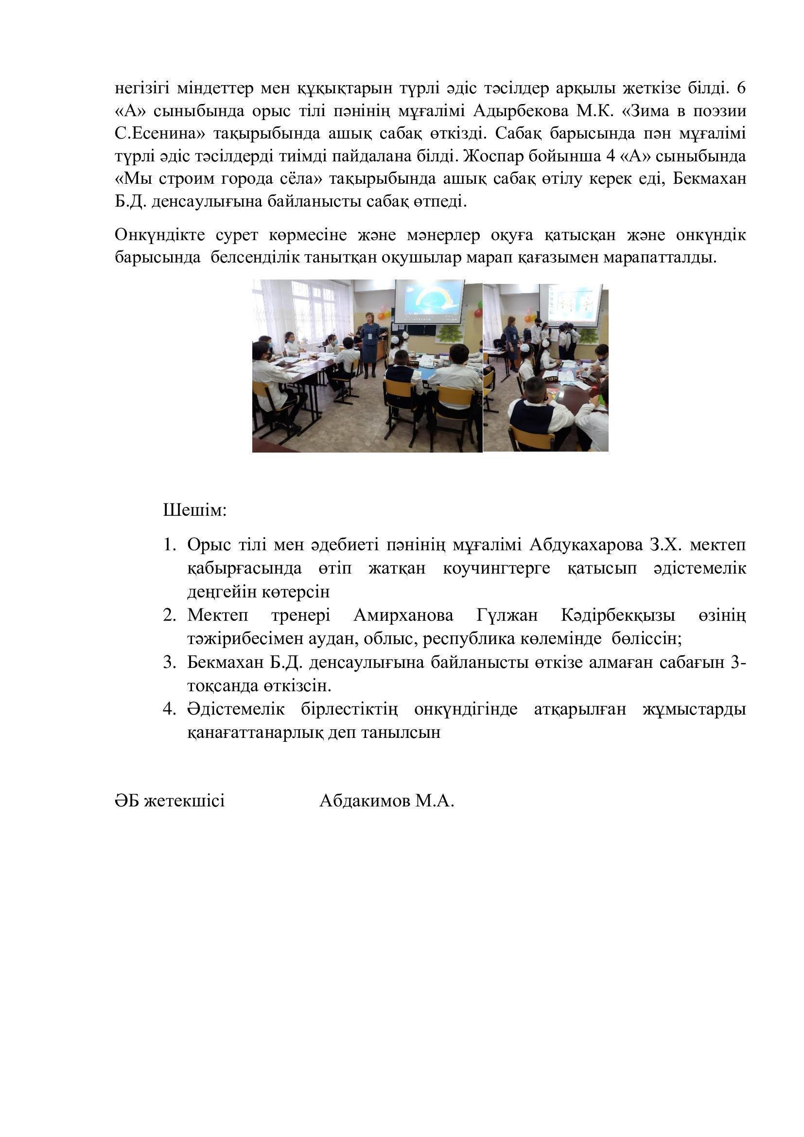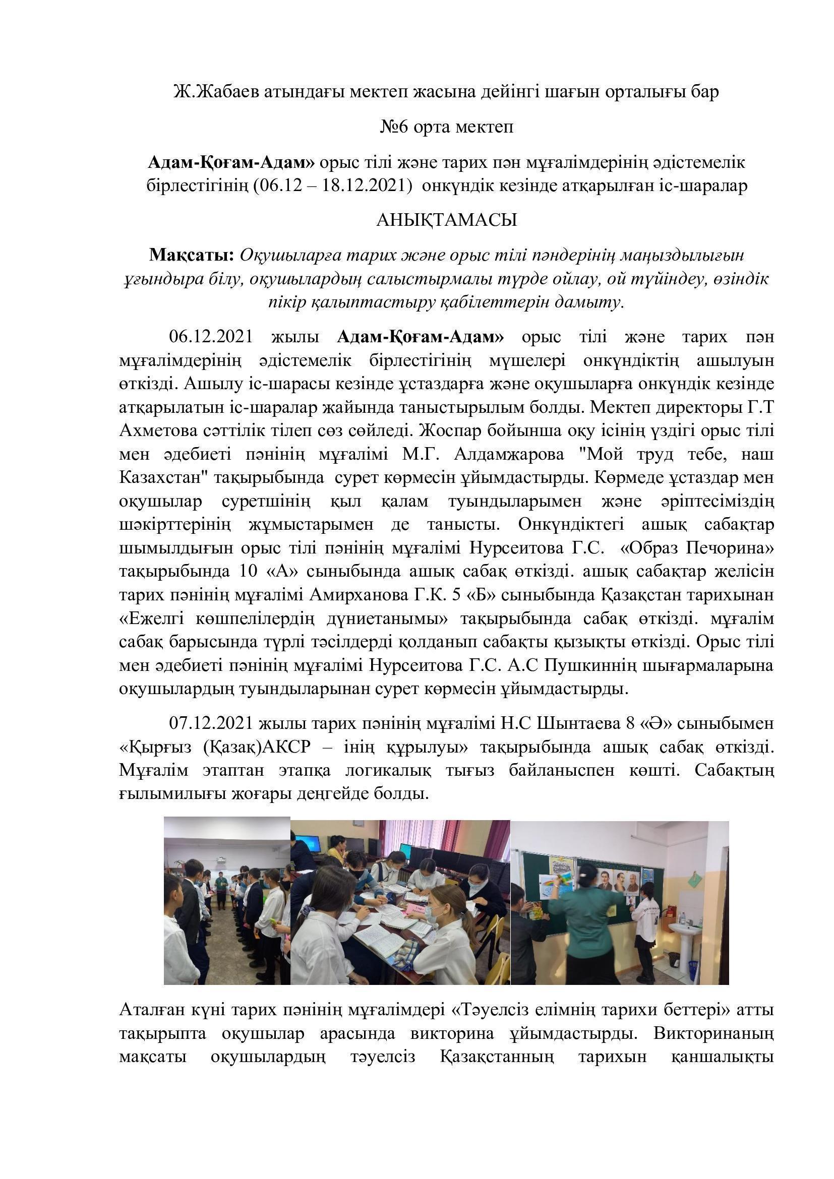 "Адам-Қоғам" тарих, орыс тілі мен әдебиеті әдістеме бірестігінің онкүндігі » АЛМАТЫ ОБЛЫСЫ БІЛІМ БАСҚАРМАСЫНЫҢ ТАЛҒАР АУДАНЫ БОЙЫНША БІЛІМ БӨЛІМІ МЕМЛЕКЕТТІК МЕКЕМЕСІНІҢ “ЖАМБЫЛ ЖАБАЕВ АТЫНДАҒЫ №6 ЖАЛПЫ БІЛІМ БЕРЕТІН ОРТА МЕКТЕБІ” КОММУНАЛДЫҚ МЕМЛЕКЕТТІК МЕКЕМЕСІ