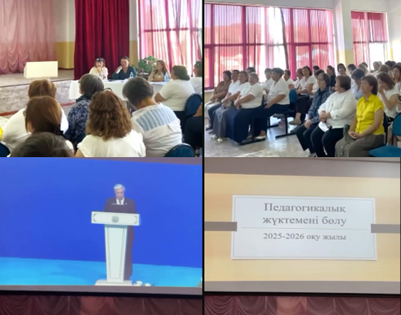 Педагогикалық кеңес барысында Қазақстан Республикасының Президенті Қ.Тоқаев пен ҚР Оқу-ағарту министрі Ғ.Бейсембаевтың 2025 жылғы республикалық тамыз кеңесінде ұстаздар қауымына арнаған негізгі басым бағыттары жөніндегі бейнематериал көрсетілді