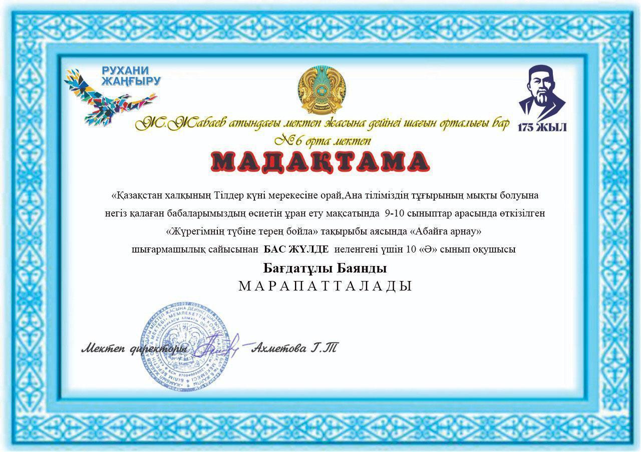 10"Ә" сынып оқушысы Бағдатұлы Баянды бас жүлде