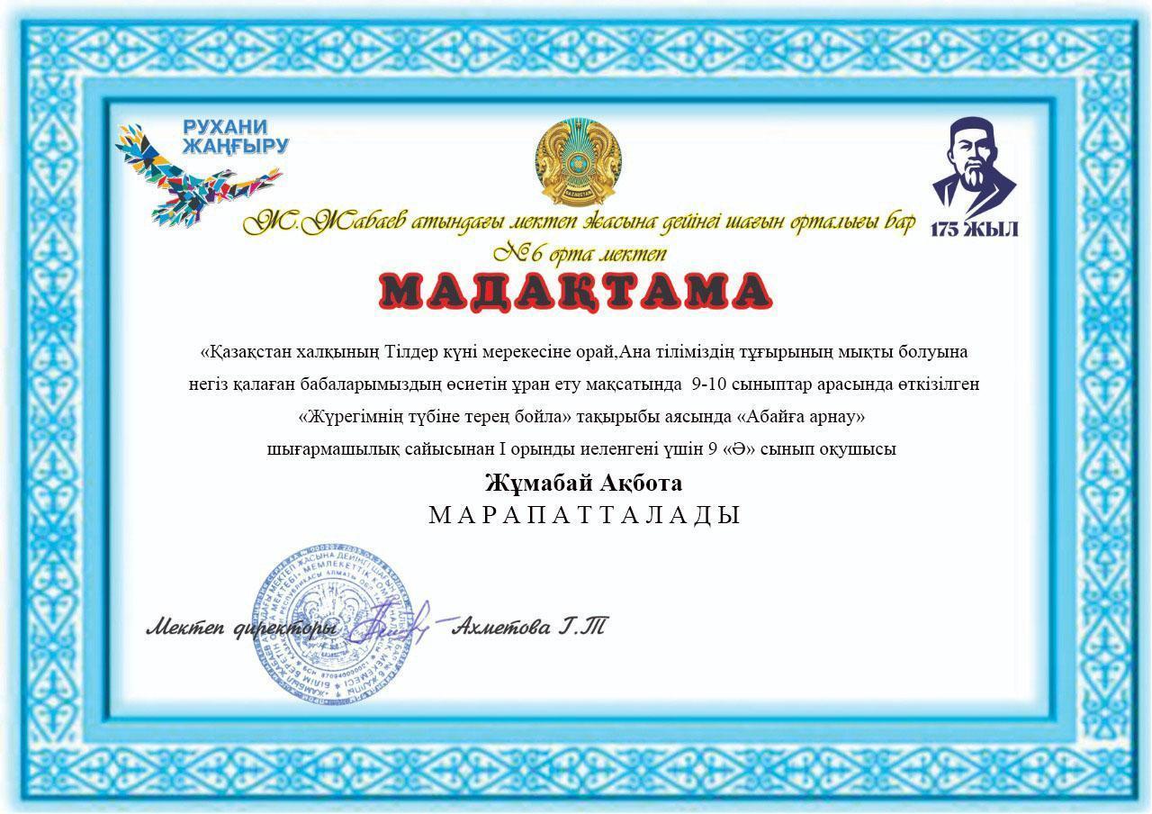Ана тіліміздің тұғырының мықты болуына негіз қалаған бабаларымыздың өсиетін ұран ету мақсатында Қазақстан халықтарының тілдер мерекесі аясында Абайдың 175 жылдығына орай " Жүрегімнің түбіне терең бойла" тақырыбында 9-10 сыныптар арасында "Абайға арнау" атты шығармашылық сайысы өтті.Осы сайыста оқушыларымыз өз шеберліктері мен ақындық қабілеттерін көрсете білді.