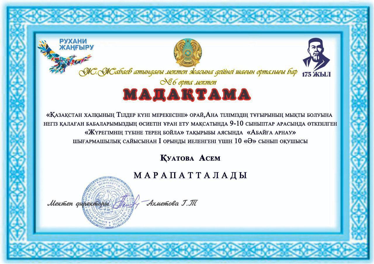 1 орынды 10"Ә" сынып оқушысы Қуатова Асель