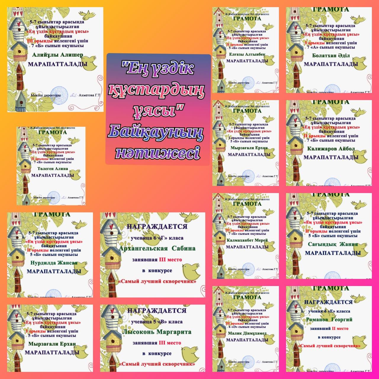 Мектепішілік 5-7 сыныптар арасында "Ең үздік құстардың ұясы" атты байқау ұйымдастырылды. Әділ-қазылар алқасы: Хуандаг Даулетхан,Каирбекова Гаухар көркем еңбек пән мұғалімі ортақ шешімге келіп қатысушыларымызға келесідей орындар берді.