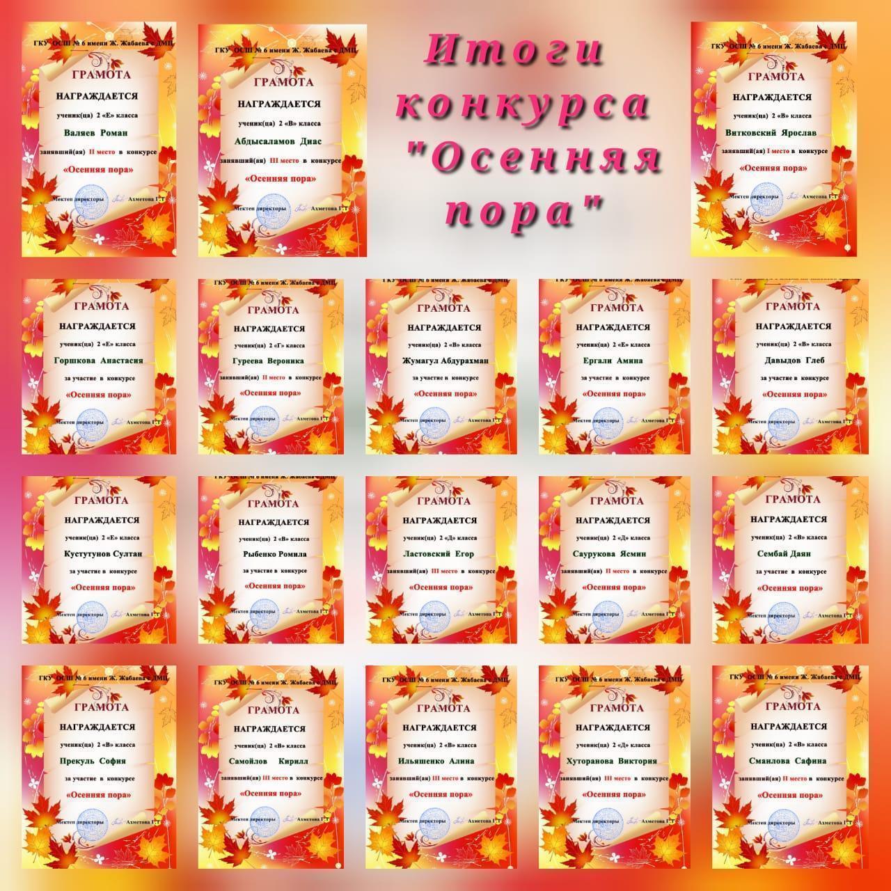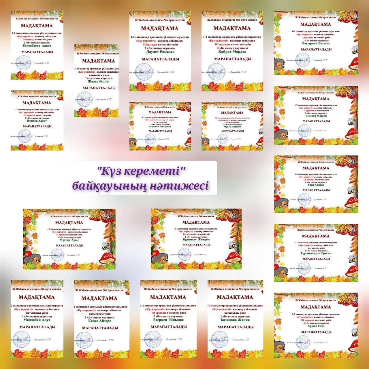 Мектепішілік 1-2 сыныптар арасында ұйымдастырылған «Күз кереметі» байқауына жалпы 74 оқушы қатысты. Оның ішінде 1 сыныптардан 36 оқушы,2 сыныптар арасында 38 оқушы қатысты. Әділ-қазылар алқасы ортақ шешімге келіп төмендегі орындар берілді. Белсенді қатысқан ұстаздарымызға көп көп рахмет!