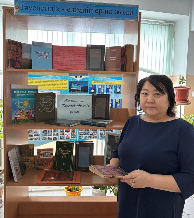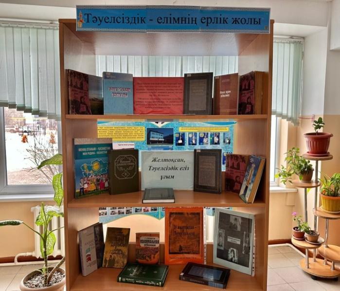 Книжная выставка "Тәуелсіздік- елімнің ерлік жолы". Цель выставки: показать учащимся, что независимость - это плод событий декабря, а борьба за нее является символом великой многовековой истории.