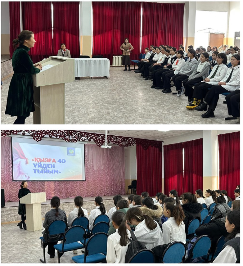 Қыздардың бойында рухани-адамгершілік қасиеттерді, әдептілік пен сыпайылықты дамыту мақсатында "Қызға қырық үйден тыю" тақырыбында жиналыс өткізілді. Жиналыста қыздармен жұмыс жетекшілері Азиева Г.Ф. және Жанпеисова Б.А. сөз сөйледі.