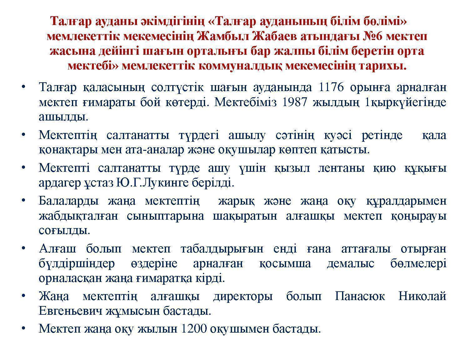 Тарихы » АЛМАТЫ ОБЛЫСЫ БІЛІМ БАСҚАРМАСЫНЫҢ ТАЛҒАР АУДАНЫ БОЙЫНША БІЛІМ БӨЛІМІ МЕМЛЕКЕТТІК МЕКЕМЕСІНІҢ “ЖАМБЫЛ ЖАБАЕВ АТЫНДАҒЫ №6 ЖАЛПЫ БІЛІМ БЕРЕТІН ОРТА МЕКТЕБІ” КОММУНАЛДЫҚ МЕМЛЕКЕТТІК МЕКЕМЕСІ
