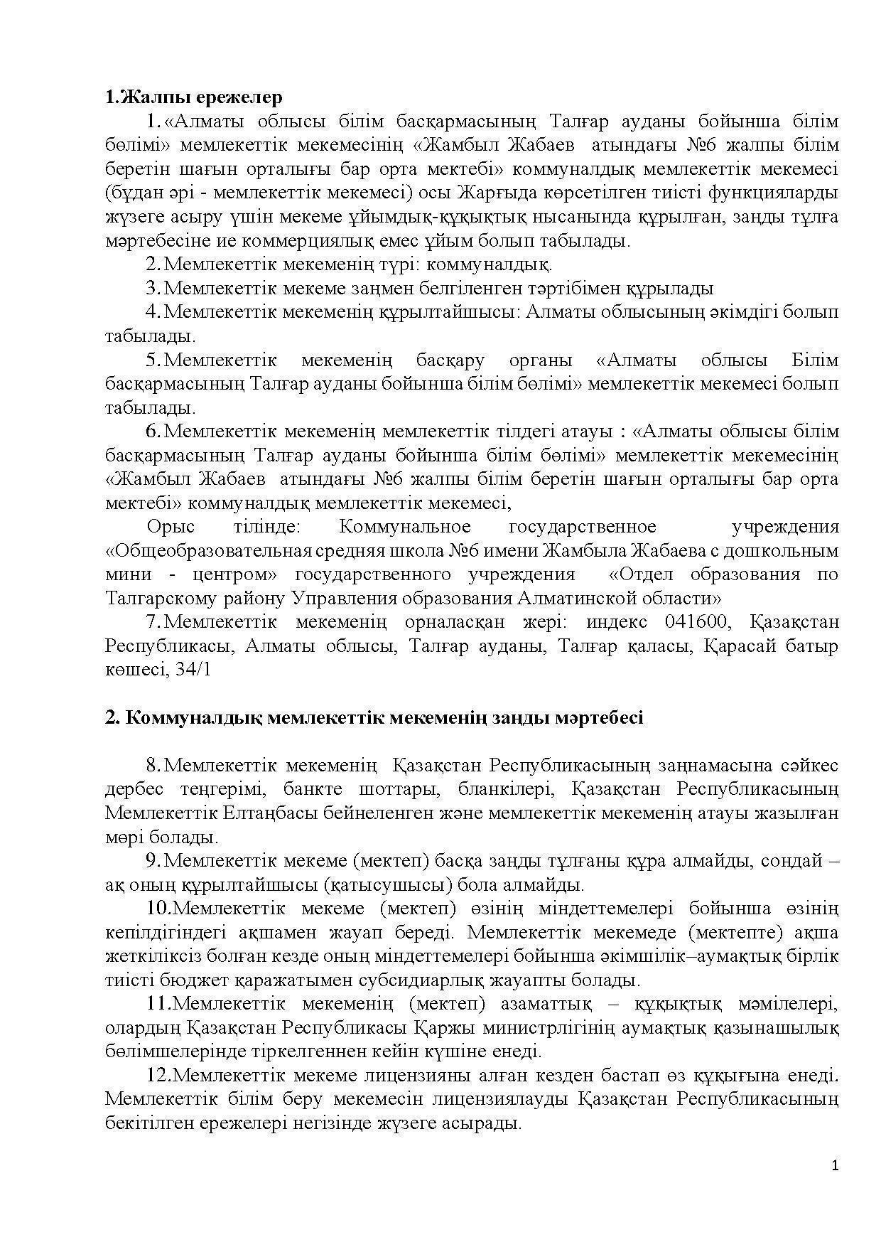 Жарғы 2021 - 2022 оқу жылы » АЛМАТЫ ОБЛЫСЫ БІЛІМ БАСҚАРМАСЫНЫҢ ТАЛҒАР АУДАНЫ БОЙЫНША БІЛІМ БӨЛІМІ МЕМЛЕКЕТТІК МЕКЕМЕСІНІҢ “ЖАМБЫЛ ЖАБАЕВ АТЫНДАҒЫ №6 ЖАЛПЫ БІЛІМ БЕРЕТІН ОРТА МЕКТЕБІ” КОММУНАЛДЫҚ МЕМЛЕКЕТТІК МЕКЕМЕСІ