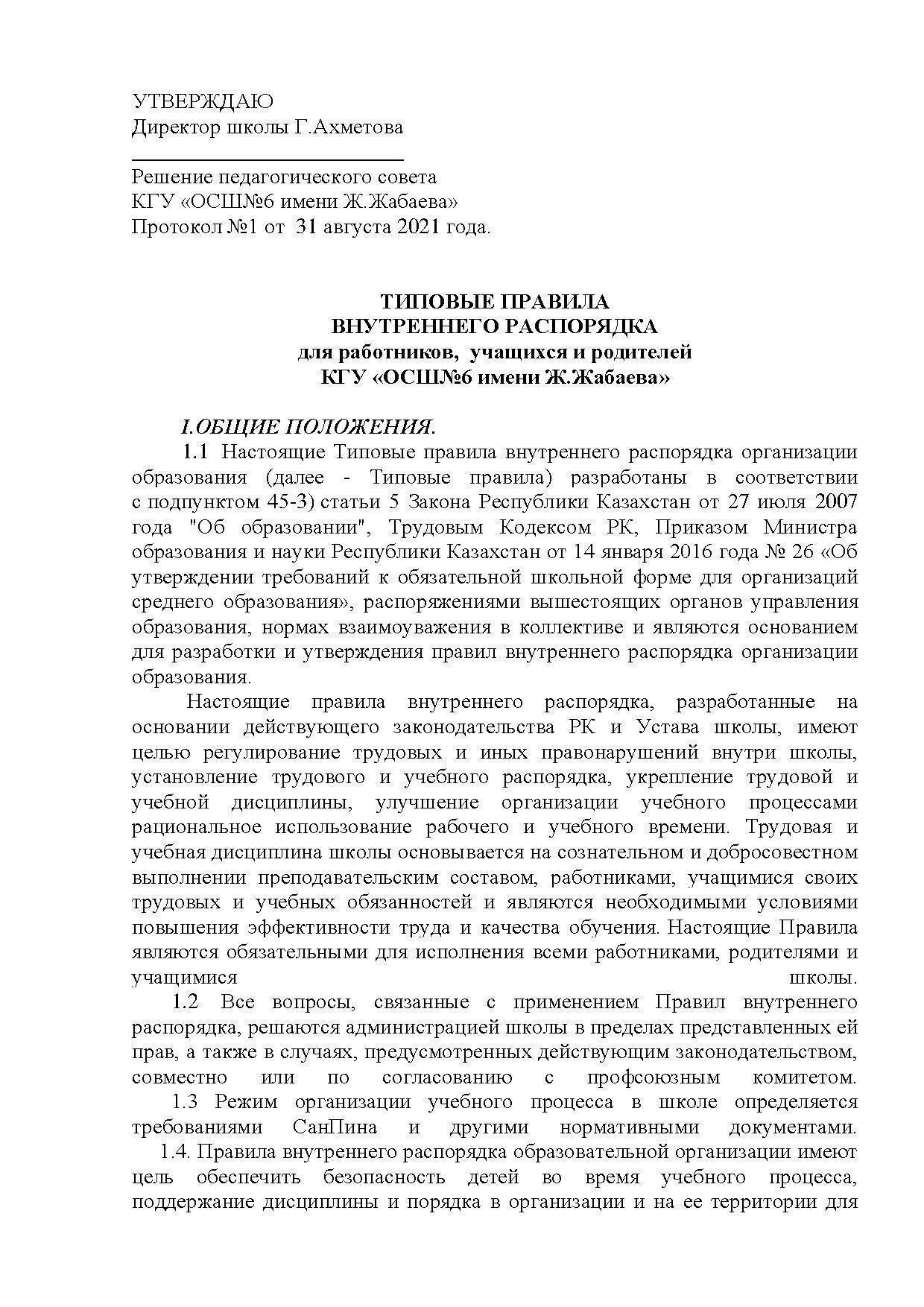 Типовые правила внутреннего распорядка » АЛМАТЫ ОБЛЫСЫ БІЛІМ БАСҚАРМАСЫНЫҢ ТАЛҒАР АУДАНЫ БОЙЫНША БІЛІМ БӨЛІМІ МЕМЛЕКЕТТІК МЕКЕМЕСІНІҢ “ЖАМБЫЛ ЖАБАЕВ АТЫНДАҒЫ №6 ЖАЛПЫ БІЛІМ БЕРЕТІН ОРТА МЕКТЕБІ” КОММУНАЛДЫҚ МЕМЛЕКЕТТІК МЕКЕМЕСІ