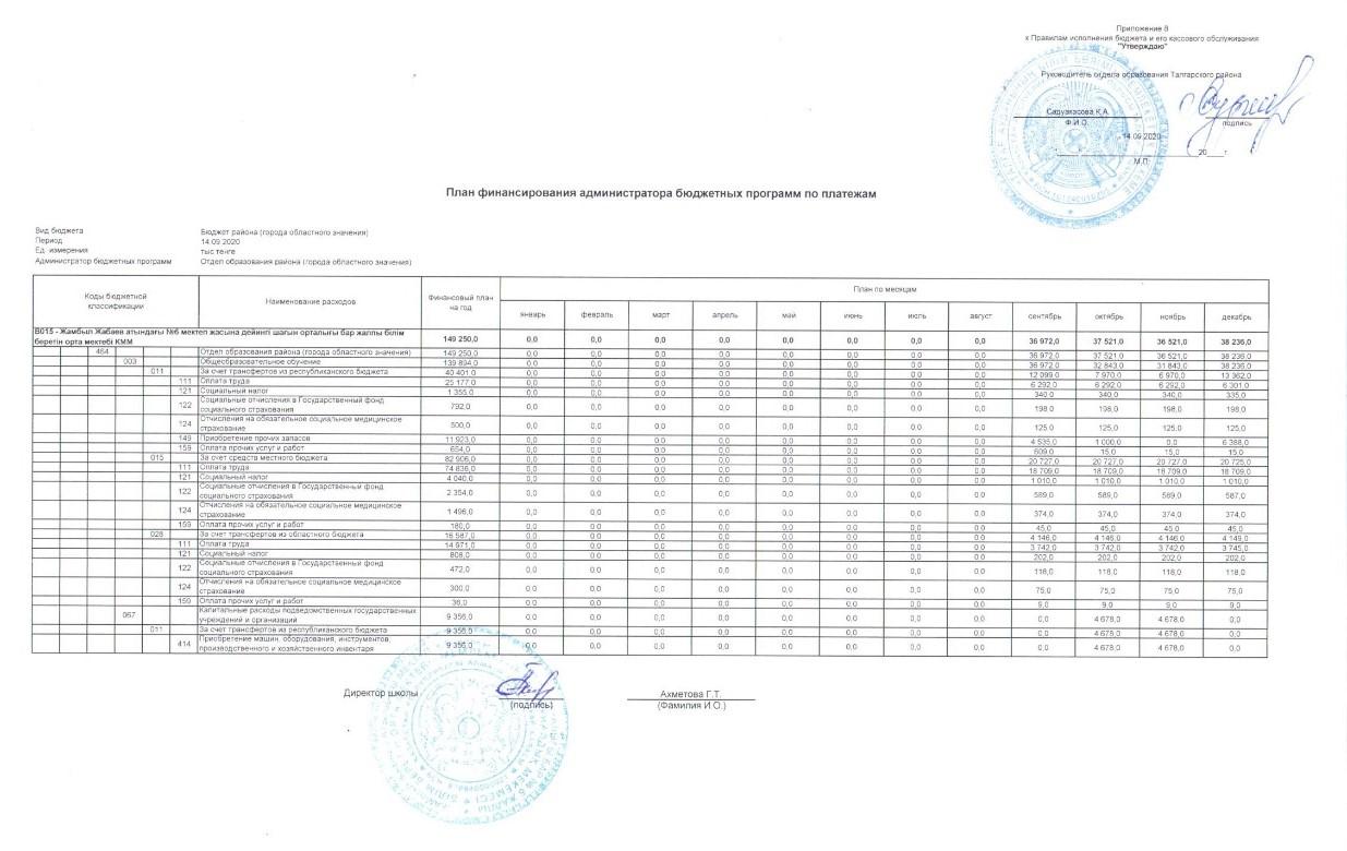Жеке қаржыландыру жоспары » АЛМАТЫ ОБЛЫСЫ БІЛІМ БАСҚАРМАСЫНЫҢ ТАЛҒАР АУДАНЫ БОЙЫНША БІЛІМ БӨЛІМІ МЕМЛЕКЕТТІК МЕКЕМЕСІНІҢ “ЖАМБЫЛ ЖАБАЕВ АТЫНДАҒЫ №6 ЖАЛПЫ БІЛІМ БЕРЕТІН ОРТА МЕКТЕБІ” КОММУНАЛДЫҚ МЕМЛЕКЕТТІК МЕКЕМЕСІ