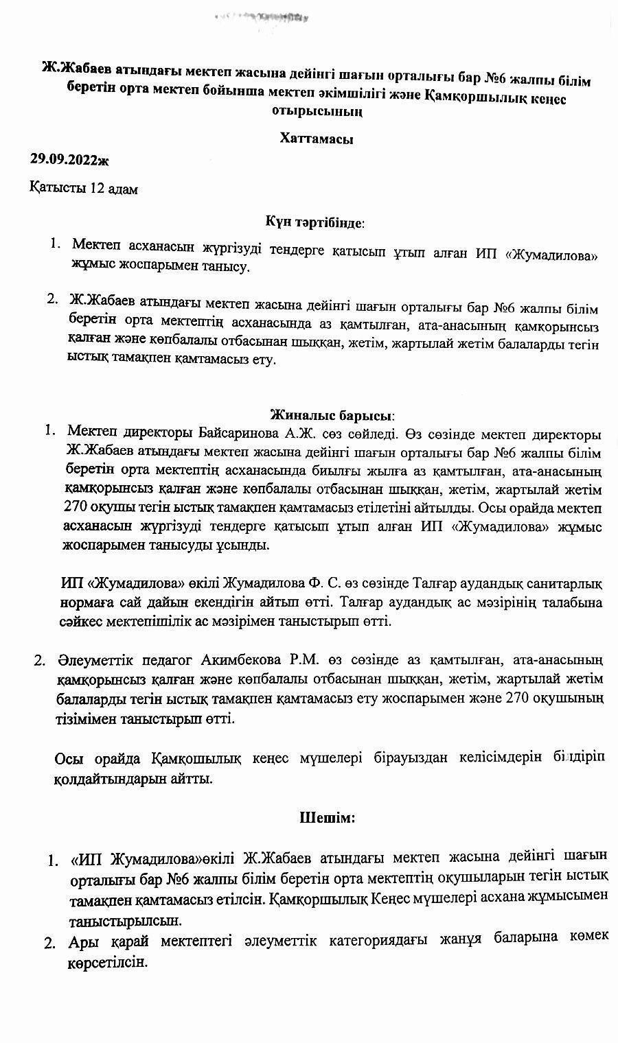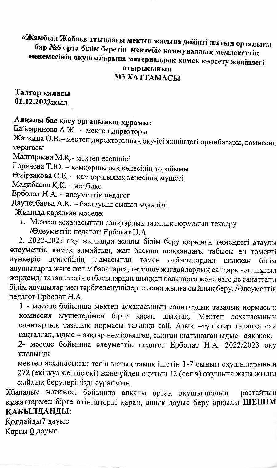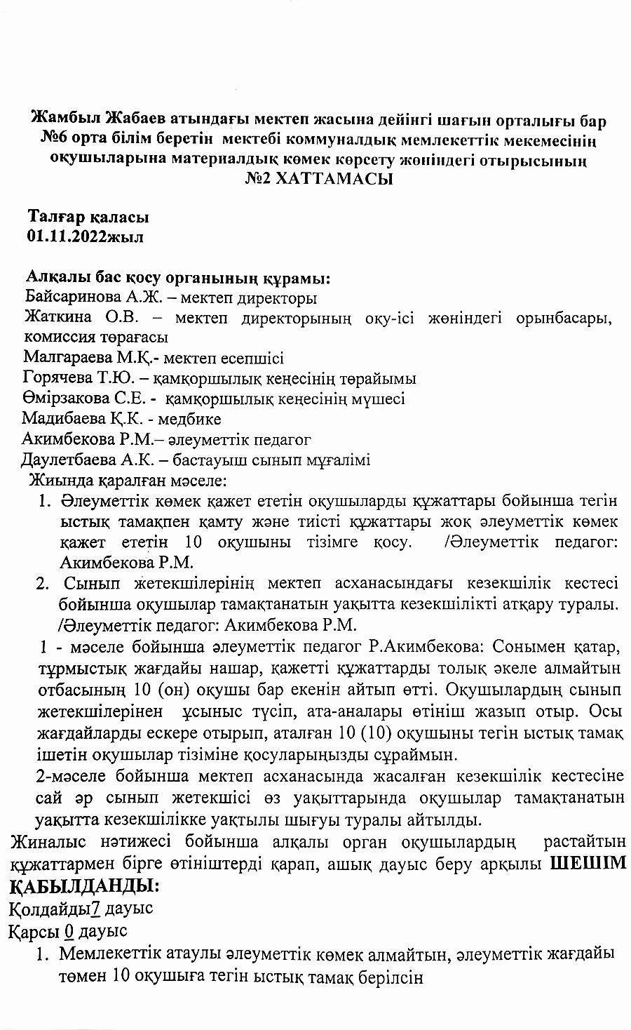 2022-2023 оқу жылының қамқоршылық кеңестің хаттамасы » АЛМАТЫ ОБЛЫСЫ БІЛІМ БАСҚАРМАСЫНЫҢ ТАЛҒАР АУДАНЫ БОЙЫНША БІЛІМ БӨЛІМІ МЕМЛЕКЕТТІК МЕКЕМЕСІНІҢ “ЖАМБЫЛ ЖАБАЕВ АТЫНДАҒЫ №6 ЖАЛПЫ БІЛІМ БЕРЕТІН ОРТА МЕКТЕБІ” КОММУНАЛДЫҚ МЕМЛЕКЕТТІК МЕКЕМЕСІ