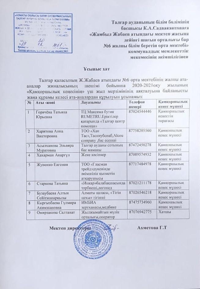 Ұсыныс хат » АЛМАТЫ ОБЛЫСЫ БІЛІМ БАСҚАРМАСЫНЫҢ ТАЛҒАР АУДАНЫ БОЙЫНША БІЛІМ БӨЛІМІ МЕМЛЕКЕТТІК МЕКЕМЕСІНІҢ “ЖАМБЫЛ ЖАБАЕВ АТЫНДАҒЫ №6 ЖАЛПЫ БІЛІМ БЕРЕТІН ОРТА МЕКТЕБІ” КОММУНАЛДЫҚ МЕМЛЕКЕТТІК МЕКЕМЕСІ