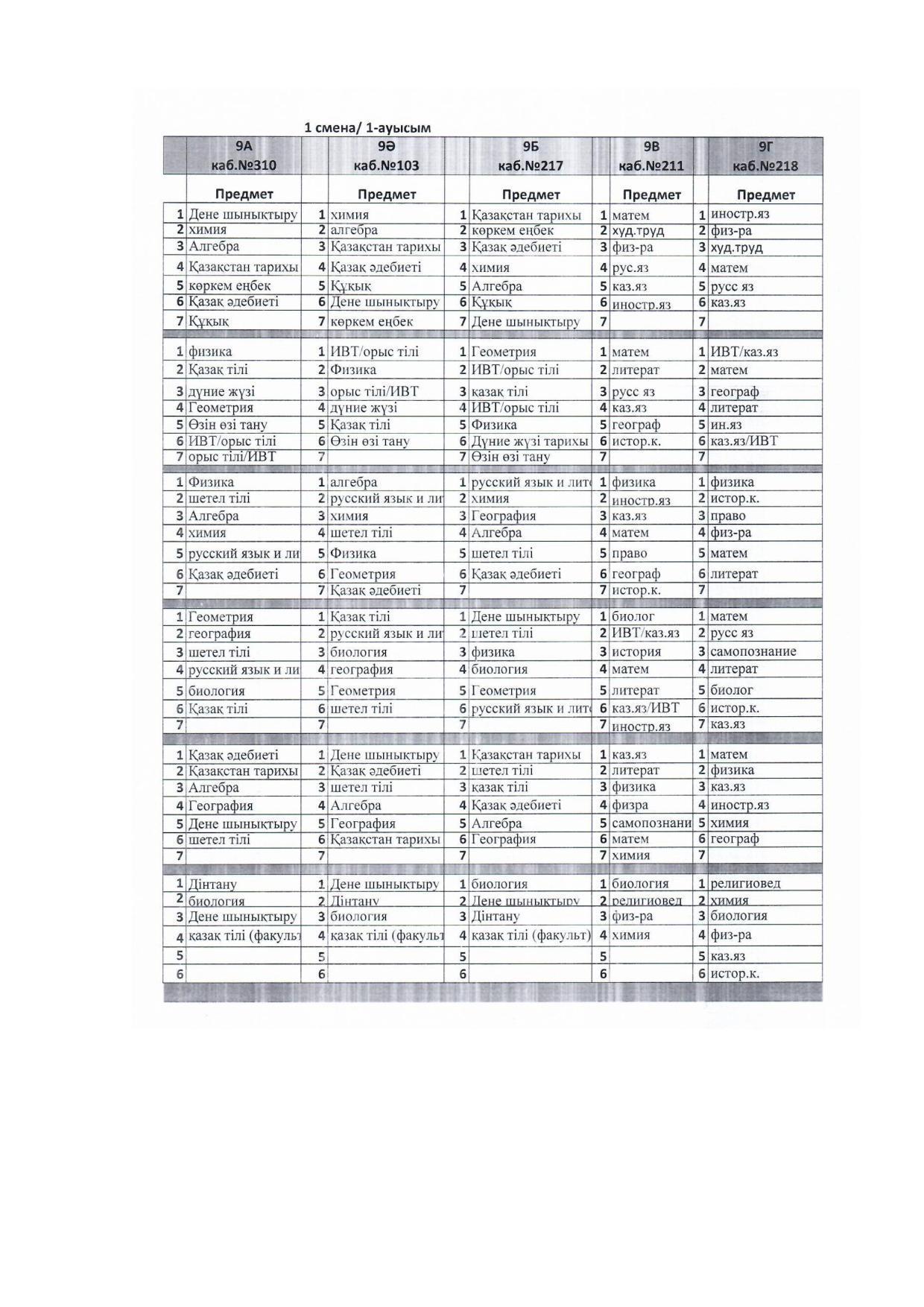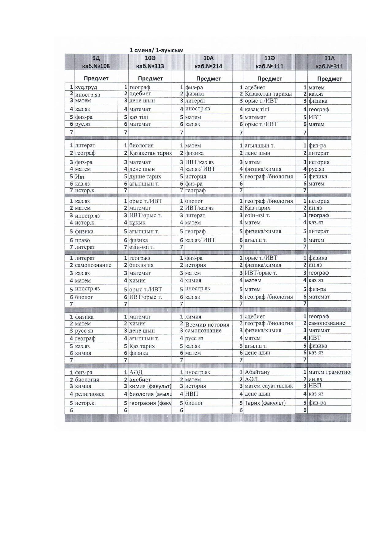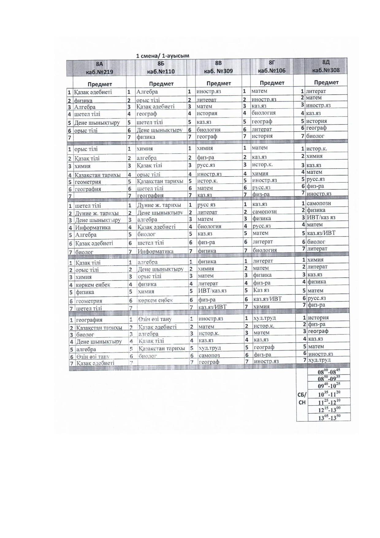 2021-2022 оқу жылы Сабақ кестесі 1 ауысым