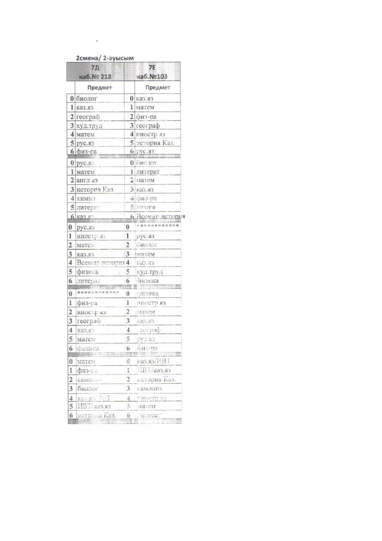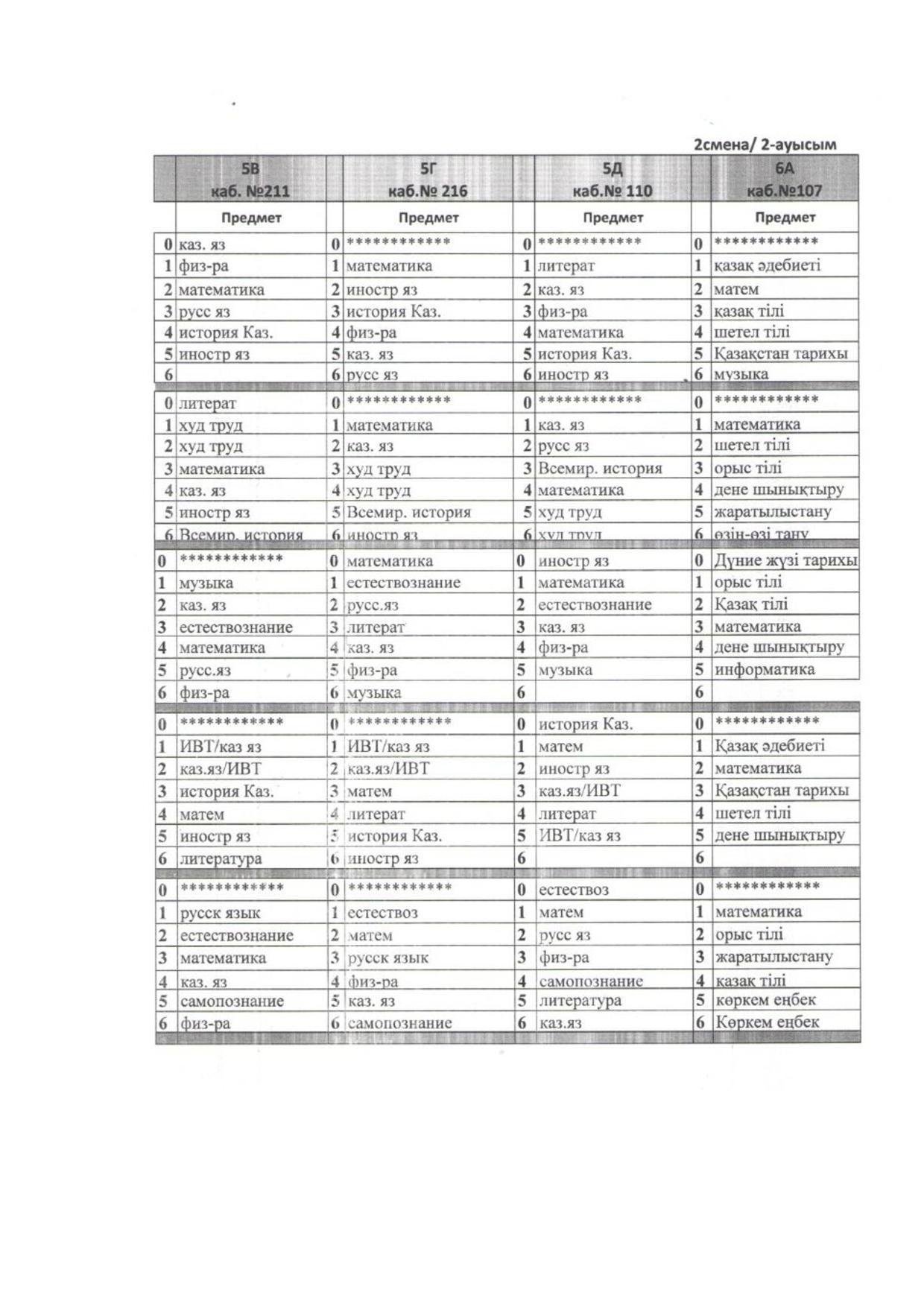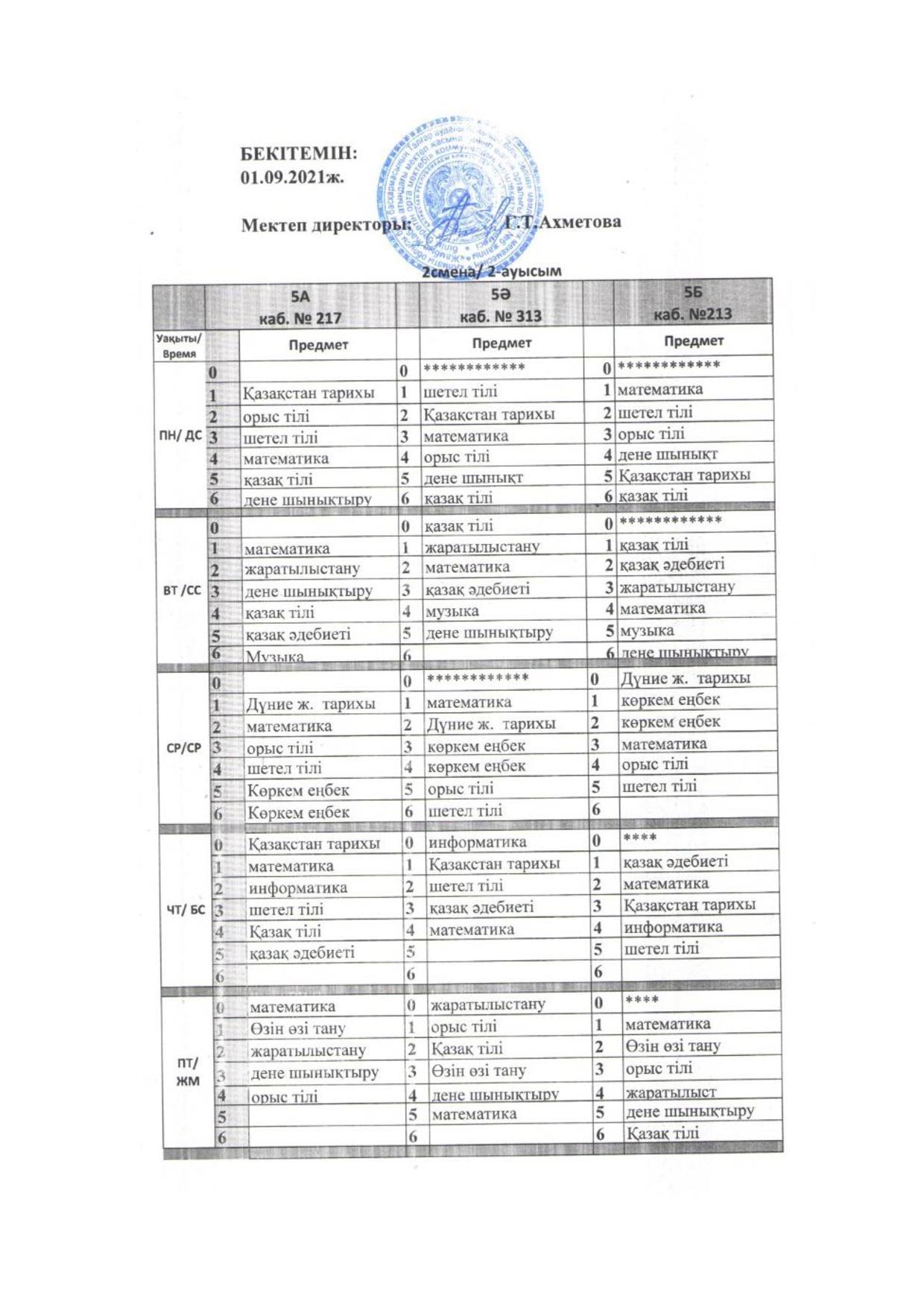 2021-2022 оқу жылы Сабақ кестесі 2 ауысым
