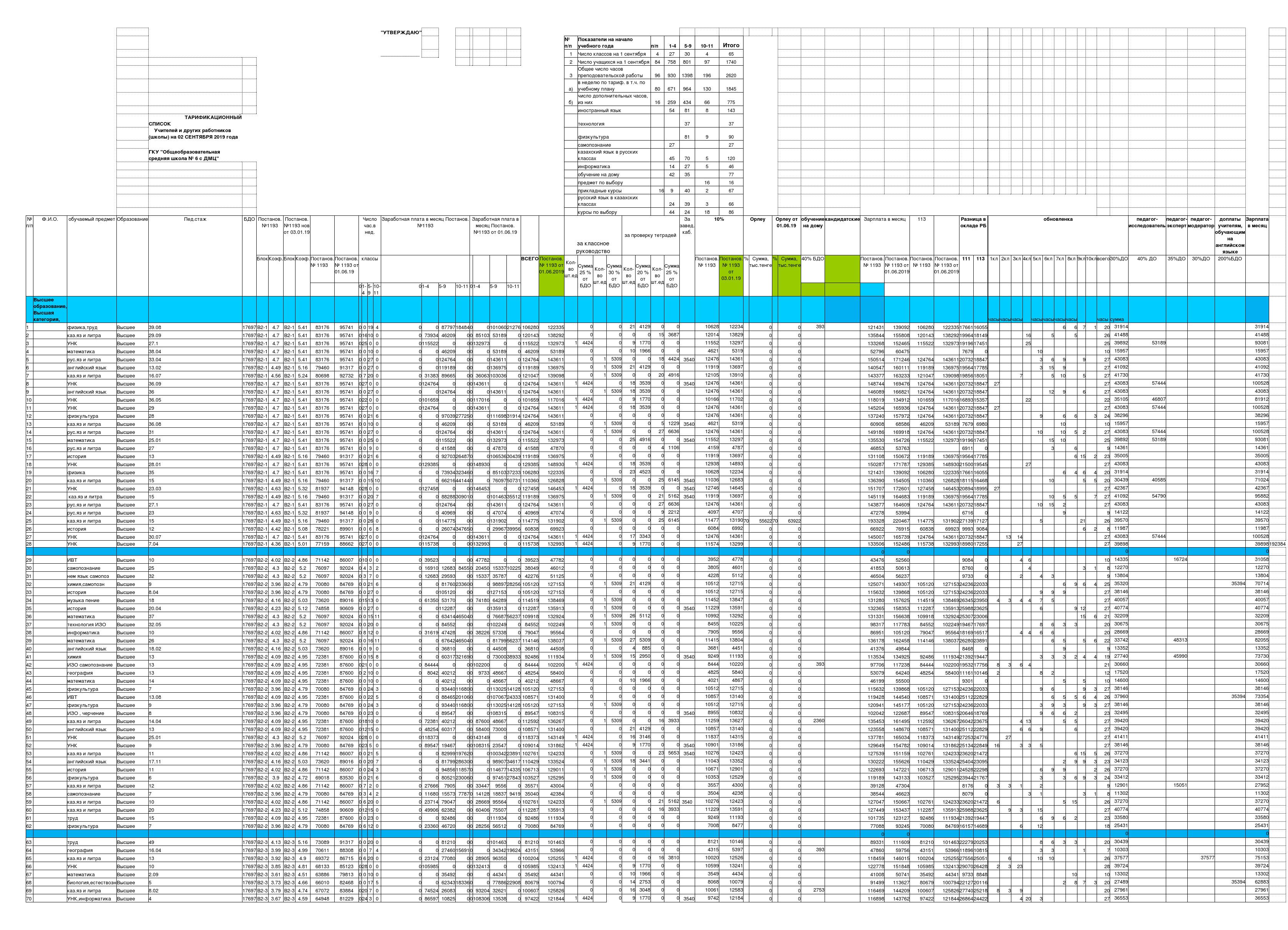 Тарификация, штатное расписание » АЛМАТЫ ОБЛЫСЫ БІЛІМ БАСҚАРМАСЫНЫҢ ТАЛҒАР АУДАНЫ БОЙЫНША БІЛІМ БӨЛІМІ МЕМЛЕКЕТТІК МЕКЕМЕСІНІҢ “ЖАМБЫЛ ЖАБАЕВ АТЫНДАҒЫ №6 ЖАЛПЫ БІЛІМ БЕРЕТІН ОРТА МЕКТЕБІ” КОММУНАЛДЫҚ МЕМЛЕКЕТТІК МЕКЕМЕСІ
