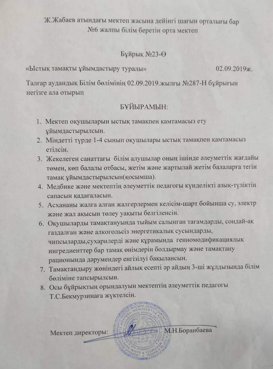 Ыстық тамақты ұйымдастыру туралы бұйрық » АЛМАТЫ ОБЛЫСЫ БІЛІМ БАСҚАРМАСЫНЫҢ ТАЛҒАР АУДАНЫ БОЙЫНША БІЛІМ БӨЛІМІ МЕМЛЕКЕТТІК МЕКЕМЕСІНІҢ “ЖАМБЫЛ ЖАБАЕВ АТЫНДАҒЫ №6 ЖАЛПЫ БІЛІМ БЕРЕТІН ОРТА МЕКТЕБІ” КОММУНАЛДЫҚ МЕМЛЕКЕТТІК МЕКЕМЕСІ