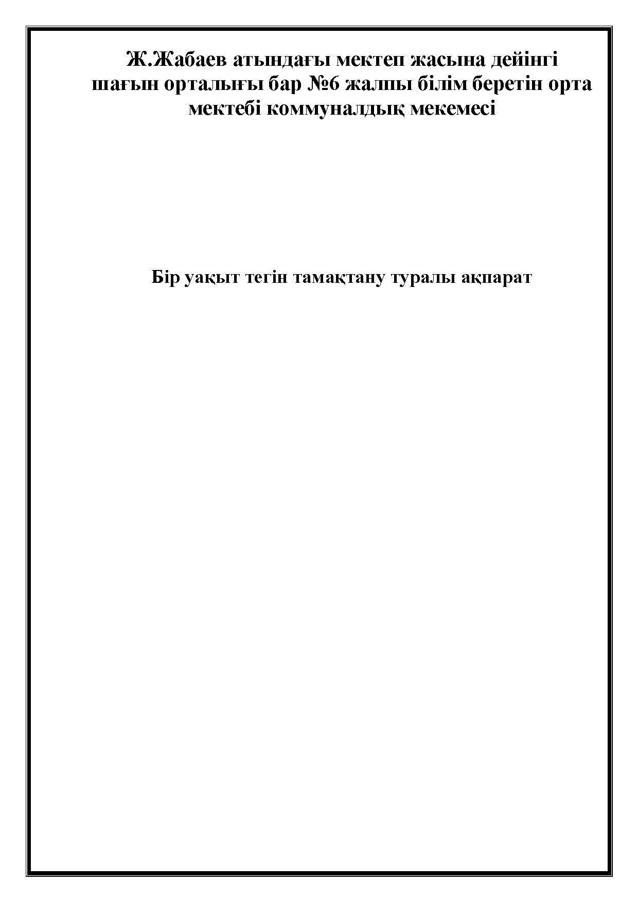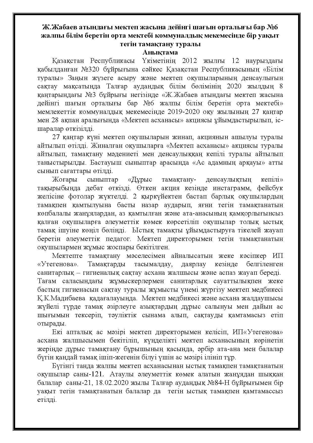 Бір уақыт тегін тамақтану туралы ақпарат » АЛМАТЫ ОБЛЫСЫ БІЛІМ БАСҚАРМАСЫНЫҢ ТАЛҒАР АУДАНЫ БОЙЫНША БІЛІМ БӨЛІМІ МЕМЛЕКЕТТІК МЕКЕМЕСІНІҢ “ЖАМБЫЛ ЖАБАЕВ АТЫНДАҒЫ №6 ЖАЛПЫ БІЛІМ БЕРЕТІН ОРТА МЕКТЕБІ” КОММУНАЛДЫҚ МЕМЛЕКЕТТІК МЕКЕМЕСІ