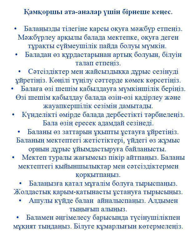 Қамқоршы ата-аналар үшін кеңестер » АЛМАТЫ ОБЛЫСЫ БІЛІМ БАСҚАРМАСЫНЫҢ ТАЛҒАР АУДАНЫ БОЙЫНША БІЛІМ БӨЛІМІ МЕМЛЕКЕТТІК МЕКЕМЕСІНІҢ “ЖАМБЫЛ ЖАБАЕВ АТЫНДАҒЫ №6 ЖАЛПЫ БІЛІМ БЕРЕТІН ОРТА МЕКТЕБІ” КОММУНАЛДЫҚ МЕМЛЕКЕТТІК МЕКЕМЕСІ