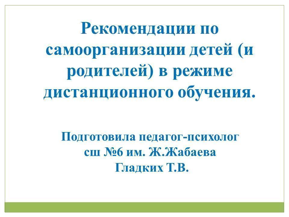 Рекомендации по самоорганизации детей (и родителей) в режиме дистанционного обучения. » АЛМАТЫ ОБЛЫСЫ БІЛІМ БАСҚАРМАСЫНЫҢ ТАЛҒАР АУДАНЫ БОЙЫНША БІЛІМ БӨЛІМІ МЕМЛЕКЕТТІК МЕКЕМЕСІНІҢ “ЖАМБЫЛ ЖАБАЕВ АТЫНДАҒЫ №6 ЖАЛПЫ БІЛІМ БЕРЕТІН ОРТА МЕКТЕБІ” КОММУНАЛДЫҚ МЕМЛЕКЕТТІК МЕКЕМЕСІ